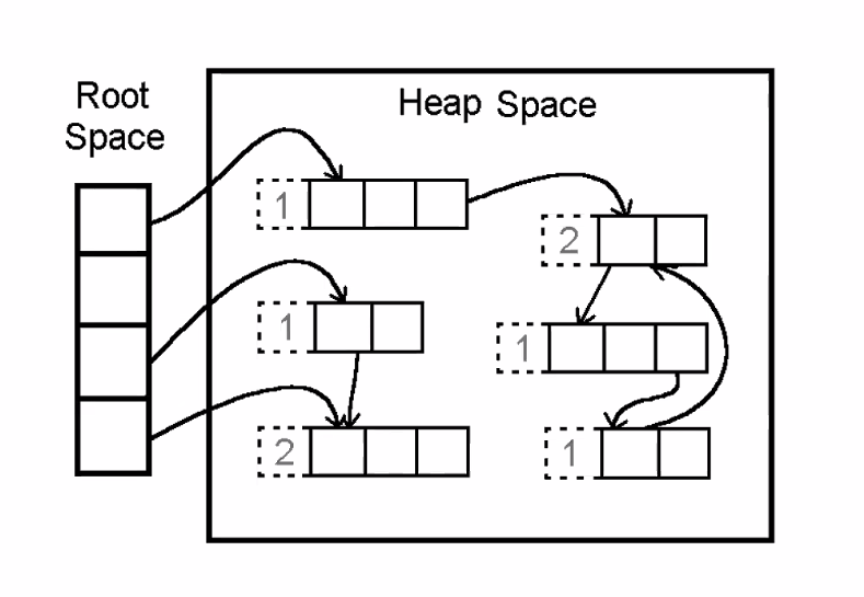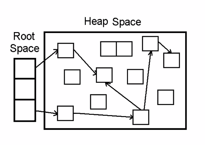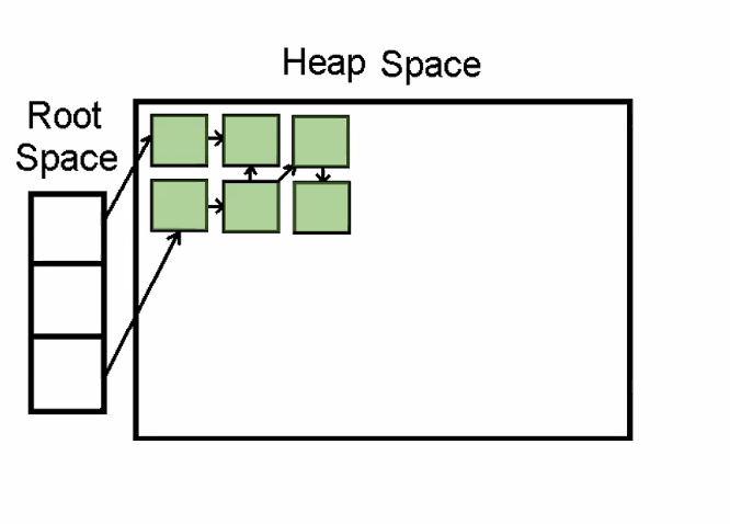 Root space에서 Heap Space의 참조를 모두 끊으면, 사용하지 않은 메모리 영역이 순환 참조로 인해 해제되지 못할 수 있다.