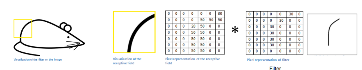 이 필터를 쥐 그림의 좌측 상단 이미지 부분에 적용해본다면, (Conv연산을 수행한다면) 매우 큰 값이 나올 것이다. 하지만 전혀 관련이 없는 이미지에 적용한다면 결과값이0에 수렴하게 나온다.