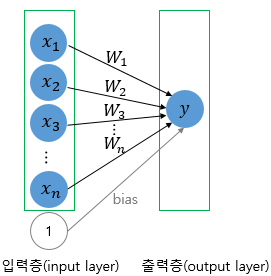여기서 x는 입력값을 의미하며, W는 가중치, y는 출력값이다. 그림 안의 원은 인공 뉴런에 해당한다고 볼 수 있다. 각각의 인공 뉴런에서 보내진 입력값 x는 각각의 가중치 W와 함께 종착지인 인공 뉴런에 전달된다. 각 입력값에는 가중치가 존재하는데, 이때 가중치의 값이 크면 클수록 해당 입력 값이 중요하다는 것을 의미한다. 입력값과 가중치가 곱해져 인공 뉴런에 보내지면 그 값이 임계치를 넘는 경우에 인공 뉴런은 출력 신호로서 1을 출력하고, 그렇지 않을 경우에는 0을 출력한다.